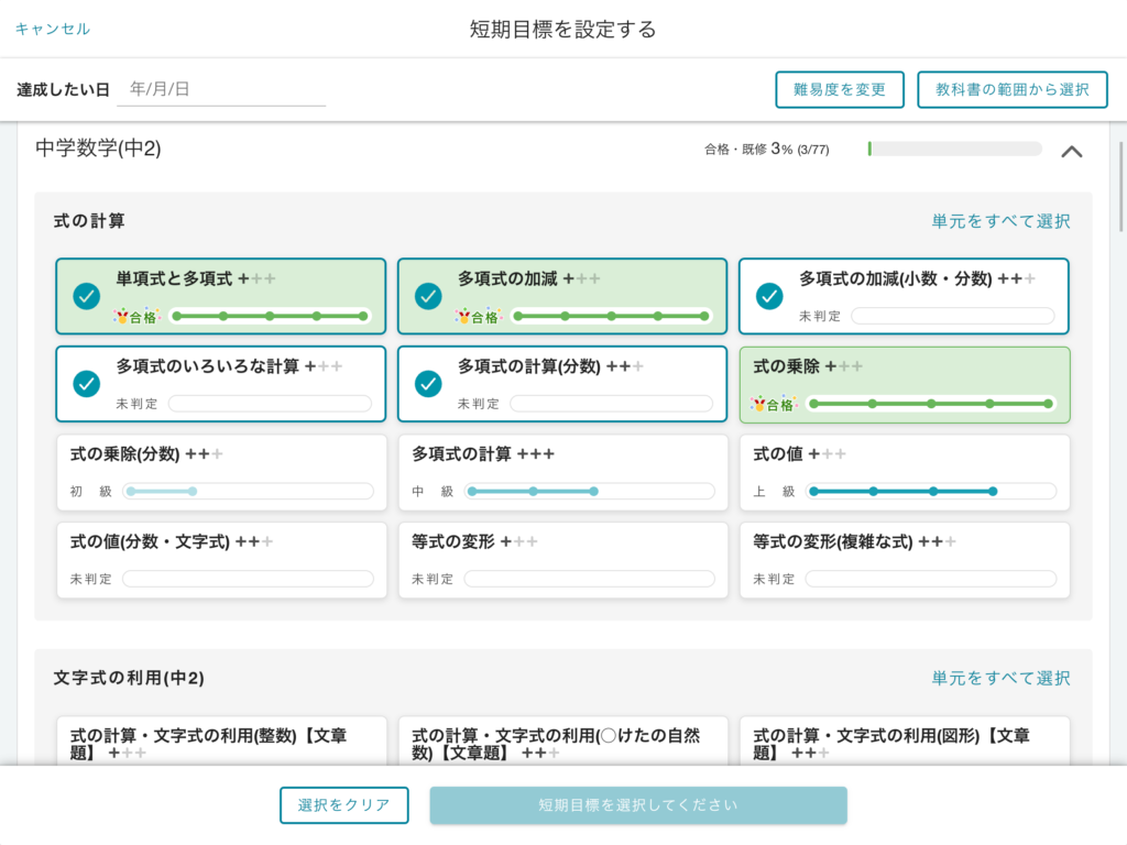 また、atama plusでは、習得済みの単元にはAIの判断で印がつきます。
